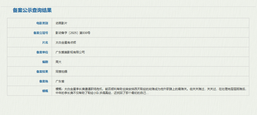 1905电影网讯 4月29日,国家电影局最新备案公示显示,动画电影《太白金星有点烦》备案立项,编剧为周大,备案单位:广东爱美影视有限公司。