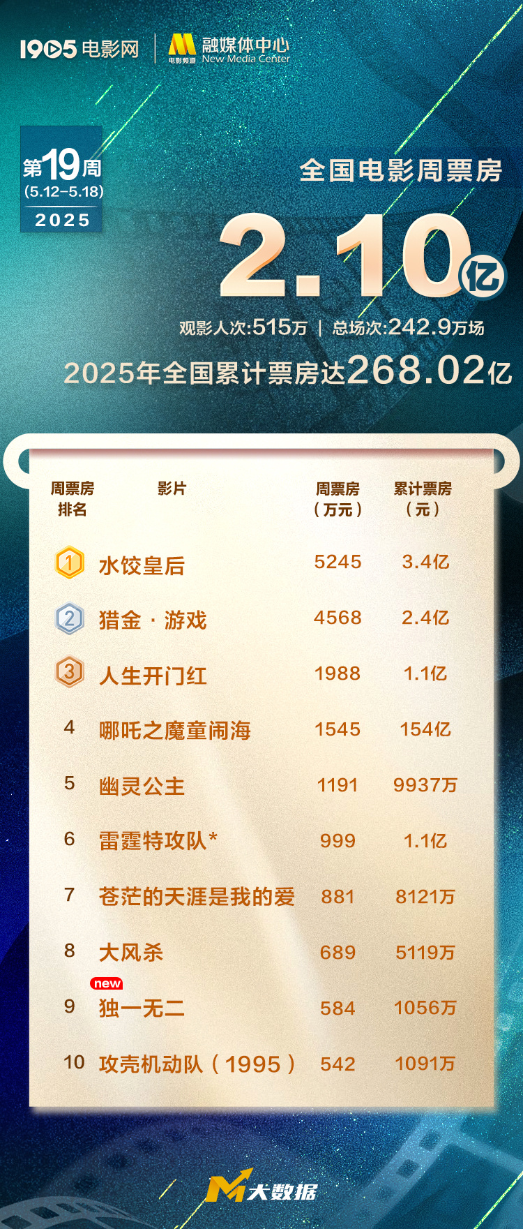 电影《水饺皇后》连续3周稳居榜首,获得连续19天单日冠军,累计票房达3.4亿元。《猎金·游戏》位列周榜亚军,累计票房2.4亿元。《哪吒之魔童闹海》回升至榜单第四位,累计票房突破154亿元。